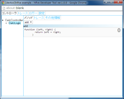 こちらがhifive開発者ツールが開いた状態になります。左下にあるウィンドウはWebアプリケーション、右上にあるのがhifive開発者ツールです。