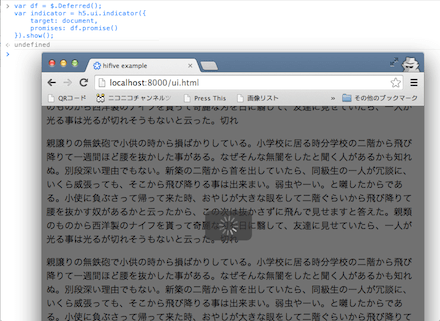 インジケータではpromiseが指定できます。オプションがpromisesになっている通り、複数渡せます。そして指定したプロミス全体がresolveまたはrejectになるとインジケータが消える仕組みです。これによりAjaxをはじめとする非同期処理の完了をもってインジケータを消すのが簡単に実現できます。