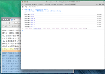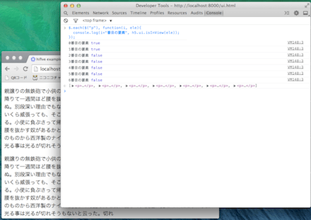 最初の二段落目までは表示されているのでtrue、その後はウィンドウ外なのでfalseが返ってきています。実際、マウスオーバーすると表示されているかどうかが確認できます。