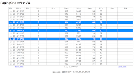 上記画面はページネーション機能があり、読み込みはAjaxを使って動的に行われます。ヘッダーは固定表示になっており、ソート機能もサポートされています。行を選択した場合、そのステータスはページネーションしても保持されています。