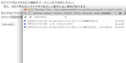 今回のコードはhifive Aspectの適用にて試すことができます。コンソールを開いてその出力結果をご覧ください。