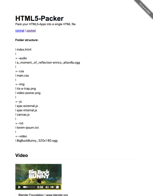 HTML5-PackerはHTML5/JavaScript/スタイルシートをはじめ、さらに画像、オーディオ、動画も含めてすべて一つのファイルとしてラッピングしてくれるソフトウェアです。ラッピングすると一つのHTMLファイルができます。他にも何のファイルもいりませんので、Webアプリケーションとしての配布がとても楽になります。