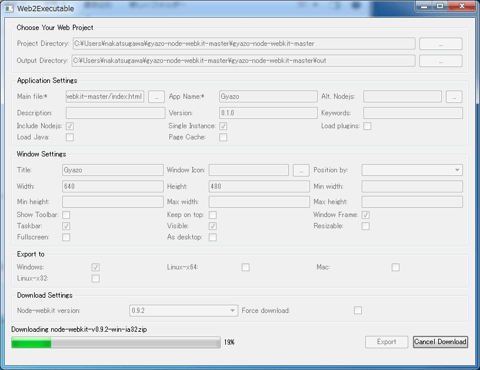 Web2Executableはnode-webkit向けに作られたパッケージをランタイムとともにラッピングし、実行ファイルに変換します。Windows/Mac OSX/Linux向けに、それ単体で動作するバイナリに変換してくれます。