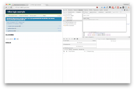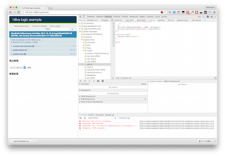 Google ChromeのDevToolsは言うに及ばず高機能です。ブレークポイント、ウォッチなど機能も多彩です。Workspace経由でのファイル編集に慣れてしまえば後はブレークポイントを仕込んでどんどん開発が進められます。