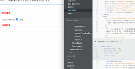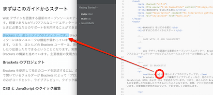Bracketsのすごい機能の一つがこのライブプレビューです。HTMLやスタイルシートの編集がその場でリアルタイムに反映されます。ライブリロードとは異なり、再読込することなくデザインの修正が反映されます。Google ChromeのDevToolsで編集しているとの同じような感覚ですが、入力補完や編集のしやすさはテキストエディタならではで、かつファイルの保存も行えますのでDevTools上で編集するよりも便利です。