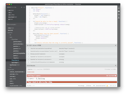 拡張機能の中にはQunit、Jasmineも用意されています。こちらもJavaScriptファイルを開くだけで自動テストを行ってくれます。