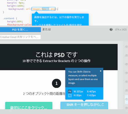 Adobeと言えばPhotoshopですが、BracketsではそのPSDファイルをとても簡単に扱えるようにする機能がプレビューで追加されています。任意のPSDファイルを選び、スタイルシートやHTMLの中でPSDファイルの一レイヤーを指定して画像として取り出せるようになっています。わざわざ素材を切り出すことなく、Brackets上だけで作業が完了します。これはデザイナーとプログラマの連携を考える上でも便利でしょう。
