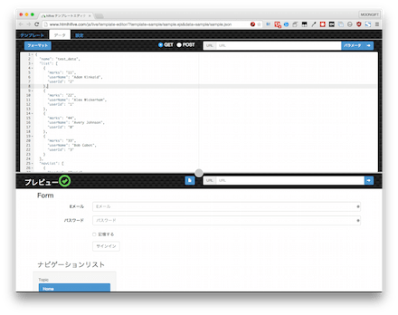 テンプレートの他に、データタブがあります。こちらはJSONデータが表示されています。このJSONデータを修正して、プレビューの表示結果を変更できます。
