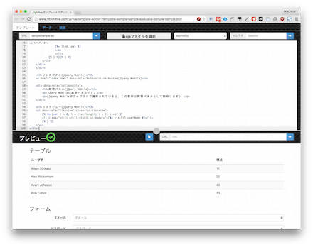 上がテンプレートになるejs、下が結果のプレビューです。テンプレートの修正はリアルタイムに反映されます。