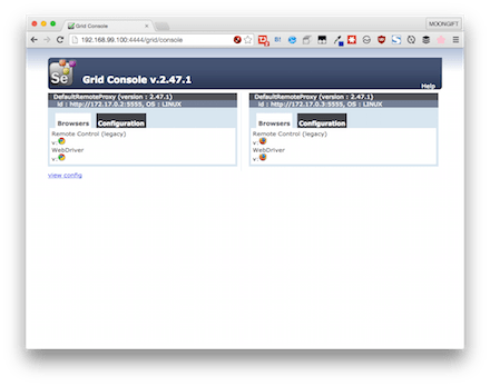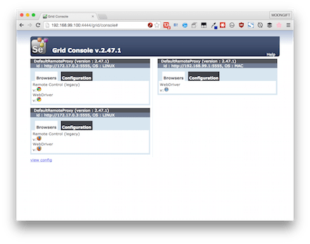 これだけでSelenium Hubが立ち上がります。Selenium Hubにアクセスする場合は、仮想環境のIPアドレスなので http://192.168.99.100:4444/grid/console などになるかと思います。