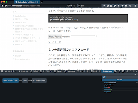 他にもWeb Audioについてもビジュアル化させることができます。開発ツール上からプロパティの値を変更して、ピッチを変えたりすることができます。