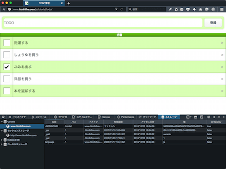 ストレージタブを使えばCookie、セッションストレージ、IndexedDBなどの値を表形式で閲覧できます。
