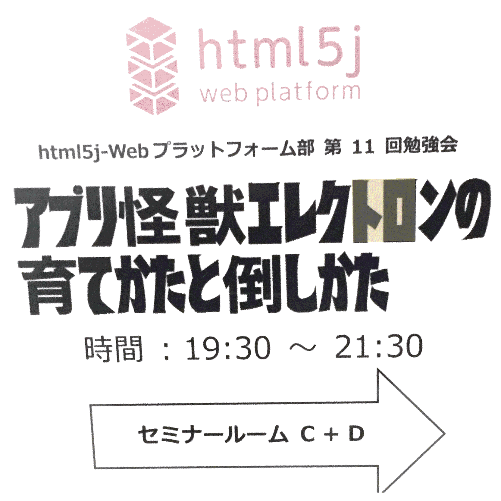 HTML5-Webプラットフォーム部の勉強会第11回勉強会 jsアプリ怪獣エレクトロンの育て方と倒し方に参加したので、そちらの内容をレポートします。