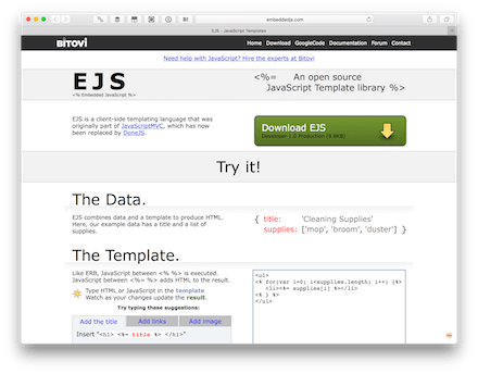 EJSはhifiveでも使っているテンプレートエンジンです。RubyのERBにインスパイアされているので、構文もよく似ています。Railsライクなヘルパー機能、テンプレートキャッシュ、パーシャルなど多機能なエンジンです。