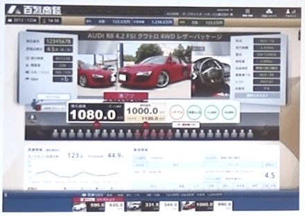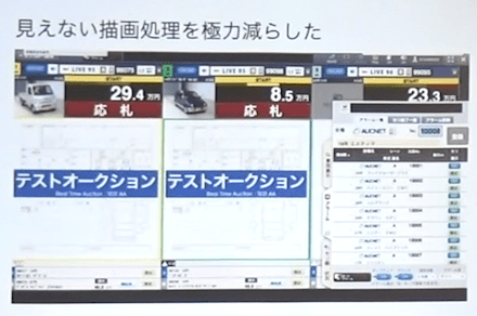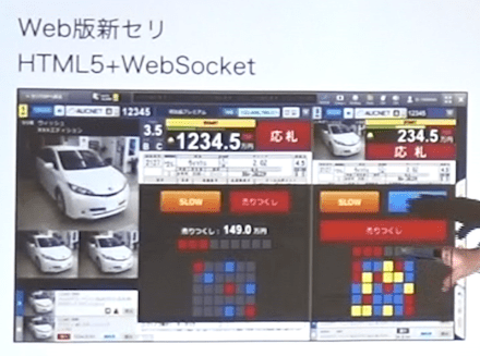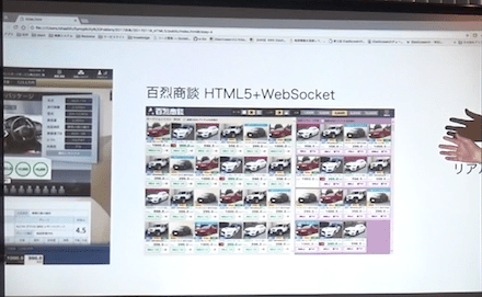 百烈商談というのは一気に100台の車両情報をまとめて表示して商談を進めるというもので、これはHTML5とWebSocketを使って構築されています。そして車両を選択すると、より細かい情報がリアルタイムで確認できるようになっています。