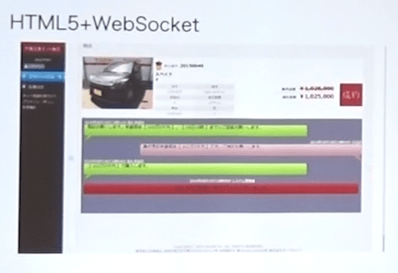 次は従来型のオークションシステムをクラウド、HTML5に載せ替えたバージョンで、こちらもWebSocketを使っています。また、フレームワークとしてhifiveを採用しています。
