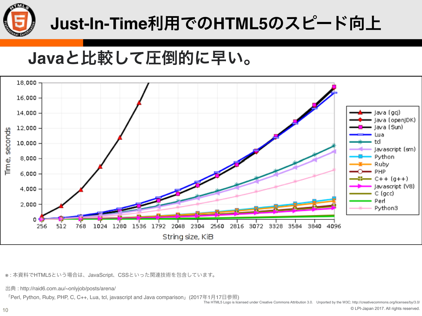 JavaScriptはインタプリタなプログラミング言語なので、実行速度が遅いんじゃないかと言われることがよくあります。しかし、JITコンパイラですので遅くはありません。速度を比較したグラフによれば、Javaよりも圧倒的に高速です。