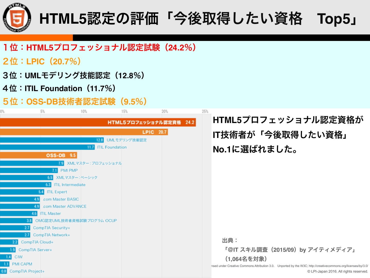 そこで役立つのがHTML5プロフェッショナル認定制度ではないかと思います。Level1とLevel2があり、前者は「マルチデバイスに対応したWebコンテンツをHTML5を使って企画・制作できる」、後者は「最新のAPIを駆使したWebアプリケーションを設計・開発できる」のを目的としています。HTML5認定の評価として、今後取得したい資格の一位に選ばれています。