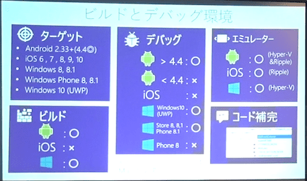 どういったものがビルドできるかと言いますと、Android 2.33+(4.4推奨)、iOS6以上、Windows8/8.1、Windows Phone 8/8.1、Windows 10となっています。ビルドはAndroidまたはWindowsアプリ、デバッグについてはAndroid 4.4以上、Windows 10、Windows 8/8.1(Phone含む)に対して行えます。最新の環境に対応していると言えます。iOSについてはmacOSでしかビルドできないという問題はありますが、Cordova向けの開発では一つの環境に対してきちんとデバッグを行っておけば、他の環境に対しても殆ど問題になることはありません。