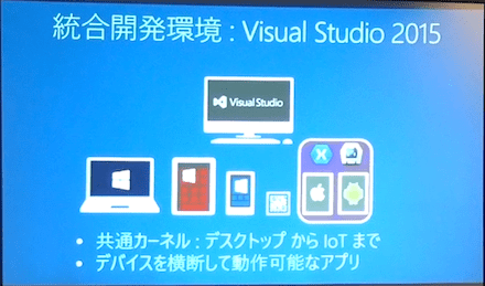 Visual Studioを使いますとApache Cordovaを使ったスマートフォンアプリが簡単に行えるようになります。Apache Cordovaは本日見てきた様々なセッションの中で語られていたHTML5を使ったアプリケーションをWebブラウザだけではなく、スマートフォンのアプリとして幅広く使えるようになります。例えば業務アプリなど、スマートフォン向けのちょっとしたアプリを作る際にも、高度なプログラミング言語を覚える必要なく、すでに知っているWeb技術で開発できるようになります。