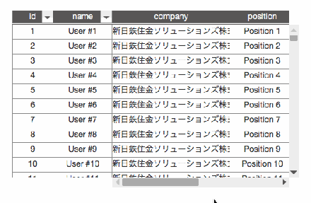 header(ヘッダー)として id と name を指定しました。これでこの2つのカラムは左側に固定表示となります。残りと main キーで指定されたカラムは表示されますが、スクロール対象となります。