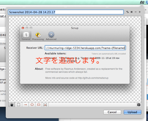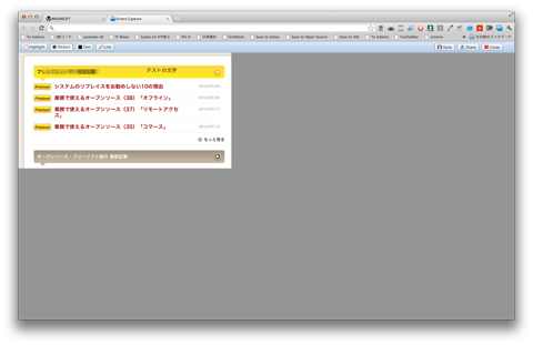 Mac OSX用。スクリーンショットの撮影に加えて、文字や円、四角などのオブジェクトを追加加工できます。そして別途オープンソース・ソフトウェアのサーバへ画像のアップロードまで行えるようになっています。