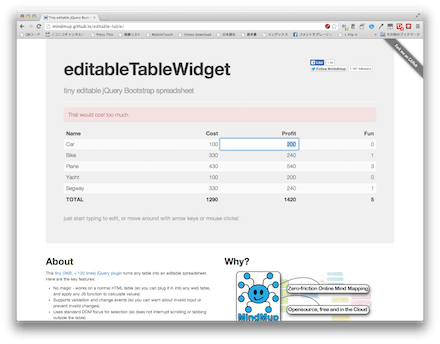 Bootstrapに対応した表計算ライブラリです。jQueryと組み合わせられるのでカスタマイズしやすいでしょう。社内の管理画面などでBootstrapを使っている場合、editableTableWidgetを使うと便利そうです。