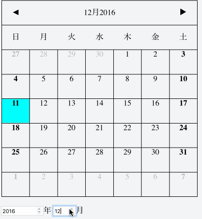 カレンダーの移動は元々表示されている三角マークで行うか、来月または先月の日付を選択する、JavaScript側で行うかの3種類になります。JavaScriptから制御できるので、自由にカスタマイズできるでしょう。