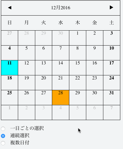 カレンダーコンポーネントの使い方、第三弾です。今回はカレンダーの日付選択方式を変更します。