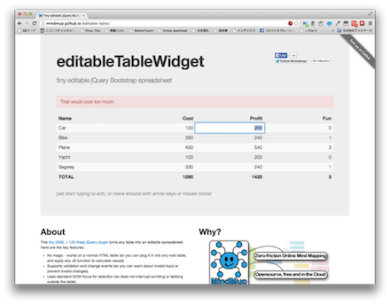 Editable TableもBootstrapのテーブルを強化します。機能としてはインラインでの編集機能を追加しますが、フッターなどの数字を編集に合わせてリアルタイムにアップデートしてくれます。