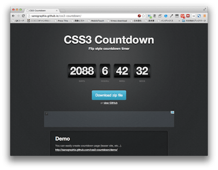 CSS3で実装されたフリップタイプのタイマーです。なお、フリップするようなアニメーションはありません。カウントダウンタイマーになるので、ティザーサイトなどで利用するのが良さそうです。