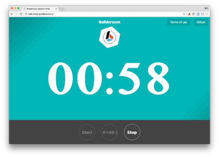 Buildersconのセッションタイマーです。デフォルトで60分のタイマーとなっています。スタートボタンを押すとカウントダウンが開始します。60分の設定であれば、30分/45分50分の3回ベルが鳴る仕組みになっています。