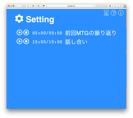 ミーティングやプレゼンテーションで使えるタイムキーピングアプリケーションです。トピックと時間を決めたら、後はクリックでタイマーがカウントダウン開始します。