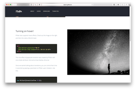 Specro/Philter: Philter is a JS plugin giving you the power to control CSS filters with HTML attributes.