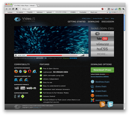 動画プレイヤーのJavaScriptとしては最も多機能でよく知られたソフトウェアだと思います。スキンのカスタマイズ、プラグインによる拡張がサポートされています。テーマやアイコンを追加することで自分たちのサイトに最適化された動画プレイヤーが作れるはずです。