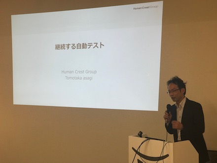 ヒューマンクレスト社の浅黄さんからはデバイステストについて紹介がありました。ブラウザのテストは自動化が進められていますが、スマートフォンデバイスにおいては実機が必要なのが現状で、社内に百台以上のデバイスが並べられているそうです。