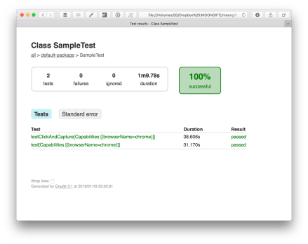 SampleTest.javaは今回は次のように記述しました。03.基本的なテストコードの書き方 – hifiveのままですが、Dockerで立ち上がるChromeは英語版になっていますので、アクセス先を日本語版指定としています。