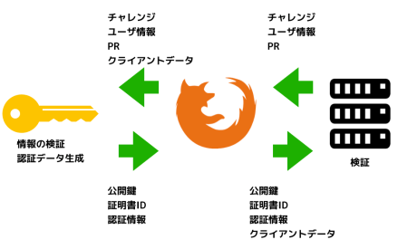 まずサーバからチャレンジが送られてきます。WebブラウザではチャレンジとRP、クライアントデータのハッシュをAuthenticatorに送ります。Authenticatorでは値の検証とアサーションの作成を行います。Webブラウザには認証データと署名が送られてきます。Webブラウザは認証データと署名、そしてクライアントデータのJSONをサーバに送ります。サーバはそれらの値を検証します。