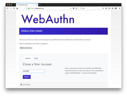現在、一番分かりやすいデモは https://webauthn.org/ でしょう。ユーザ名だけ指定して登録し、さらにユーザ名を指定してログインできます。パスワードの入力は一切なく、認証できます。