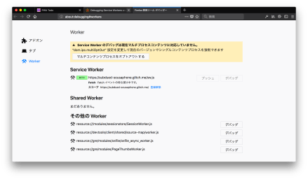 オプトアウト後、Service Workerが組み込まれているページを表示するとデバッグボタンが押せるようになります。これを押すと別ウィンドウでデバッガーが立ち上がります。