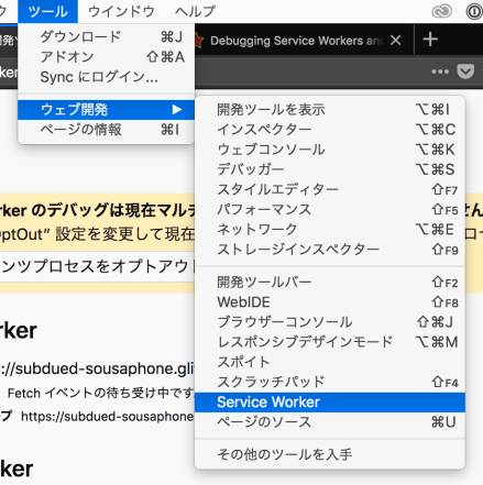 Firefoxはツールメニューのウェブ開発、Service Workerという項目を選択します。