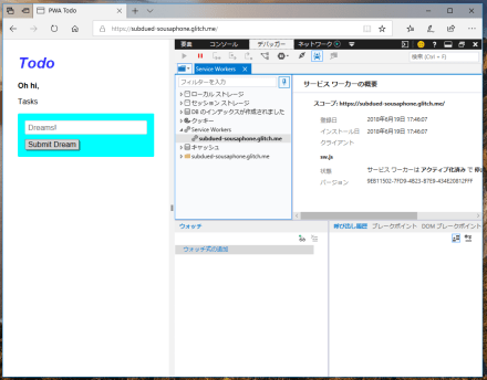 EdgeはService Workerが読み込まれていることを通知してくれます。これは他のブラウザにはない機能です。