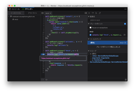 Google ChromeはWebブラウザ側、Service Worker側の両方のスクリプトについて一つの開発者ツール内で扱えます。