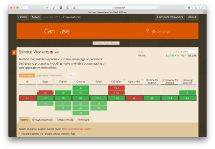 Can I useによると、モダンなブラウザの中でService Workerが使えないのはIEとOpera miniだけになっています。スマートフォンであれば安心して利用できるようになっています。