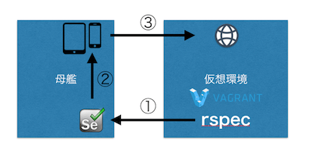 このように 仮想環境から母艦側のSelenium Serverを呼び出して、母艦のGoogle Chromeから仮想環境のWebアプリケーションをテストできるようになります。ざっくりと図にするとこのようになります。