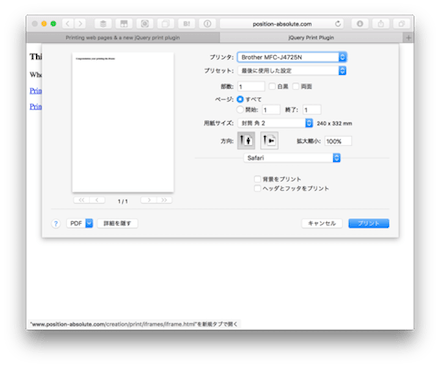 異なるコンテンツを印刷できるjQueryプラグインです。iframeにコンテンツを流し込んで、それを印刷する仕組みになっています。URLを指定してその内容を印刷することもできます。